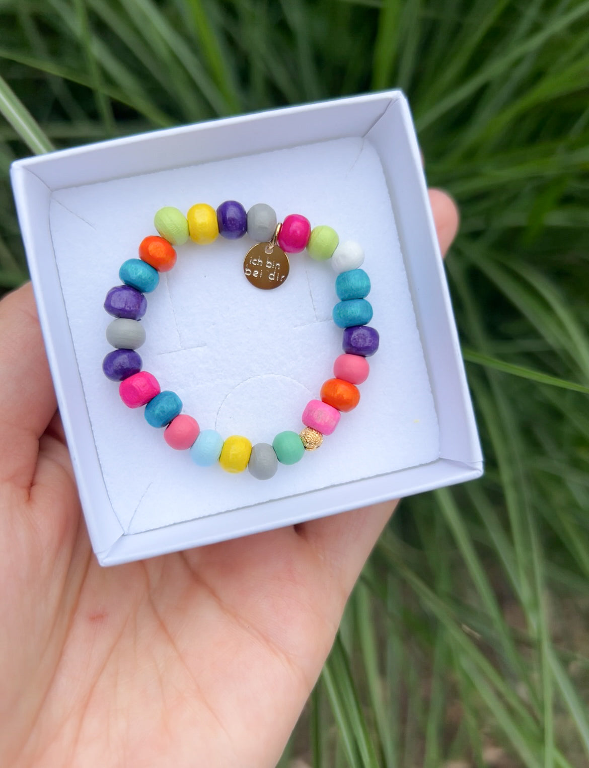 Ich bin bei dir. So wichtige Worte & so wichtig zu wissen für unsere Kleinen. Dieses Armband ist für unsere ganz Kleinen. Der Durchmesser liegt bei 4 cm ist ist so gut für Kinder zwischen 2 und 5 Jahren. Das Armband besteht aus bunten Holzperlen und ist mit einem Plättchen aus 925er Silber, vergoldet versehen. Das Band ist elastisch und wird über die Hand aufgezogen.