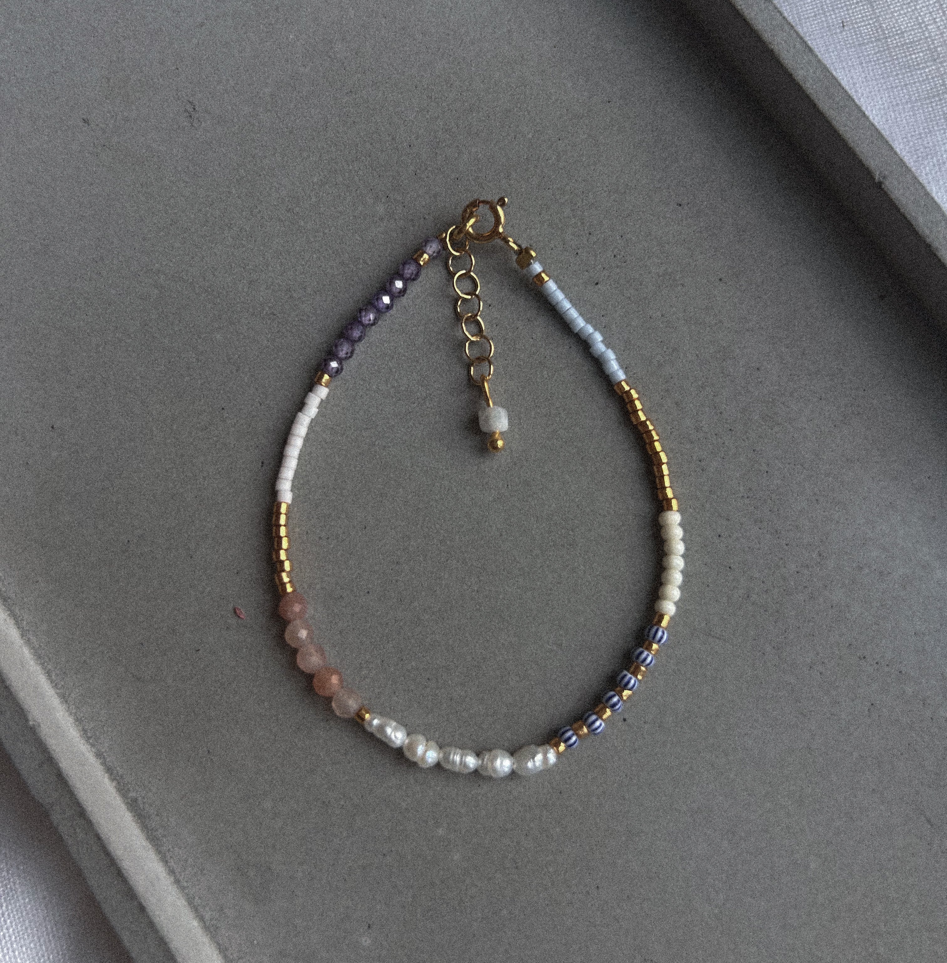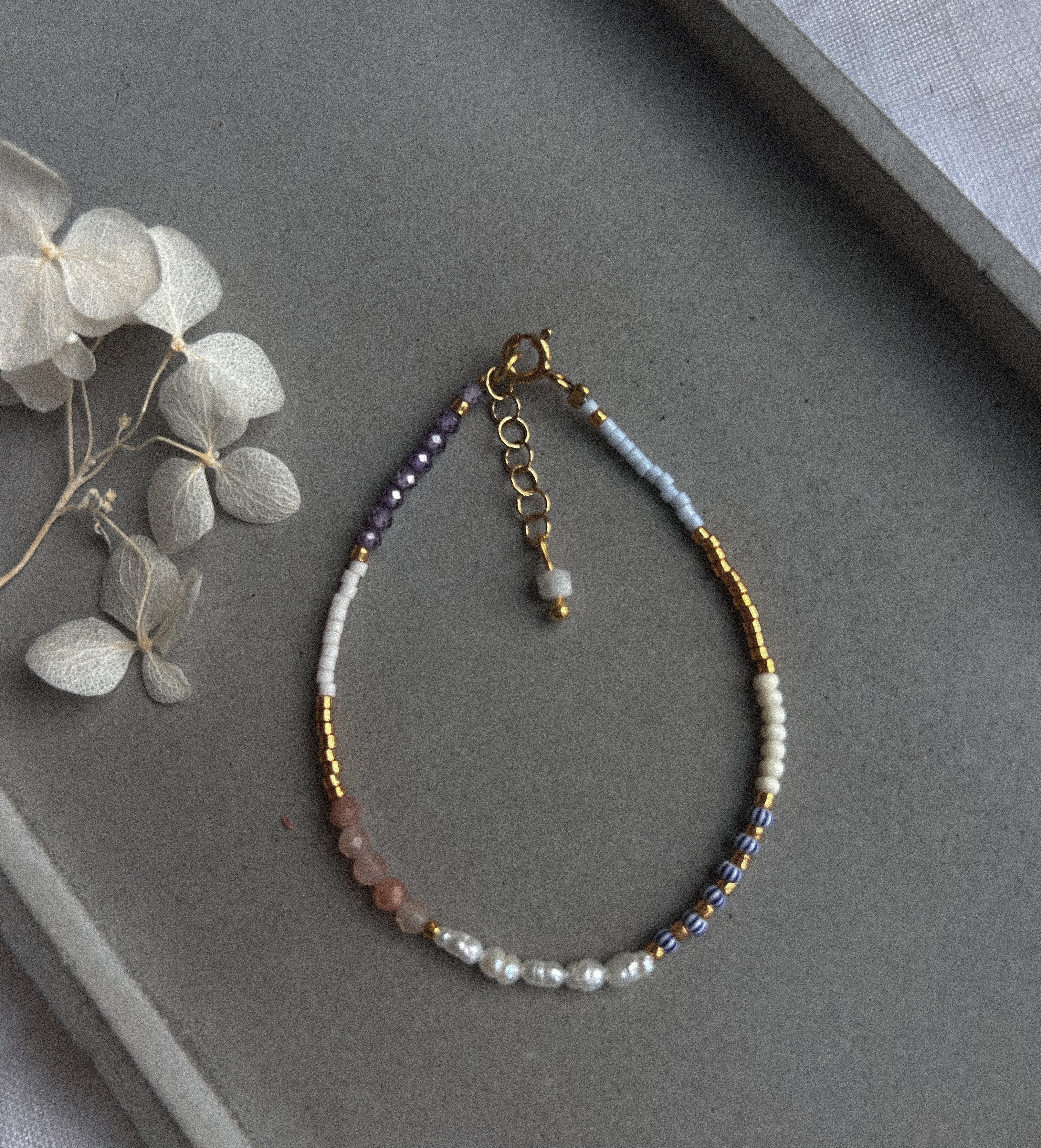Dieses zarte Armband vereint die Schönheit der Natur mit schimmernden Akzenten: Natursteinperlen, Süßwasserperlen und feine Glasperlen wechseln sich harmonisch ab.
